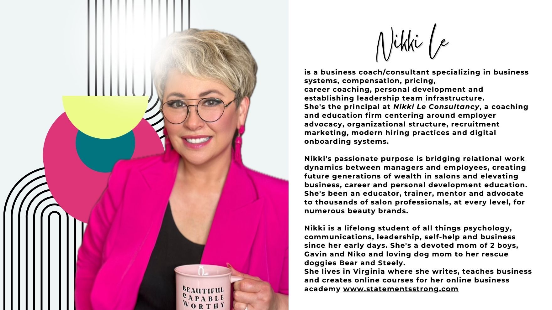 Nikki Le is a Business, HR and Compensation Consultant, specializing in building performance-driven pay structures, leadership infrastructure, and modern workforce systems that scale. As the founder of Nikki Le Consultancy, she partners with business owners to Fine-tune outdated practices in compensation, hiring Practices, onboarding processes, Employee and organizational design, transforming teams with high-performance and attaching them to your company with high-retention. Her expertise sits at the intersection of people, profit, and purpose. With a background as an educator, mentor, and brand consultant for thousands of salon professionals, Nikki brings a rare blend of industry insight and business acumen. She has built compensation ladders, leadership pipelines, and career growth systems for multi-million-dollar beauty businesses. Her mission is to close the gap between leaders and employees, unlock generational wealth practices for beauty professionals, and modernize the way we lead and grow teams in todays economy. A lifelong learner of business psychology, communication, and behavioral leadership, Nikki combines strategy with support. She has also the creator of StatementsStrong.com, an online academy for next-gen business owners and educators. Based in Virginia, Nikki is a proud mom to Gavin and Niko, and a proud doggie mom to her rescues... Bear and Steely